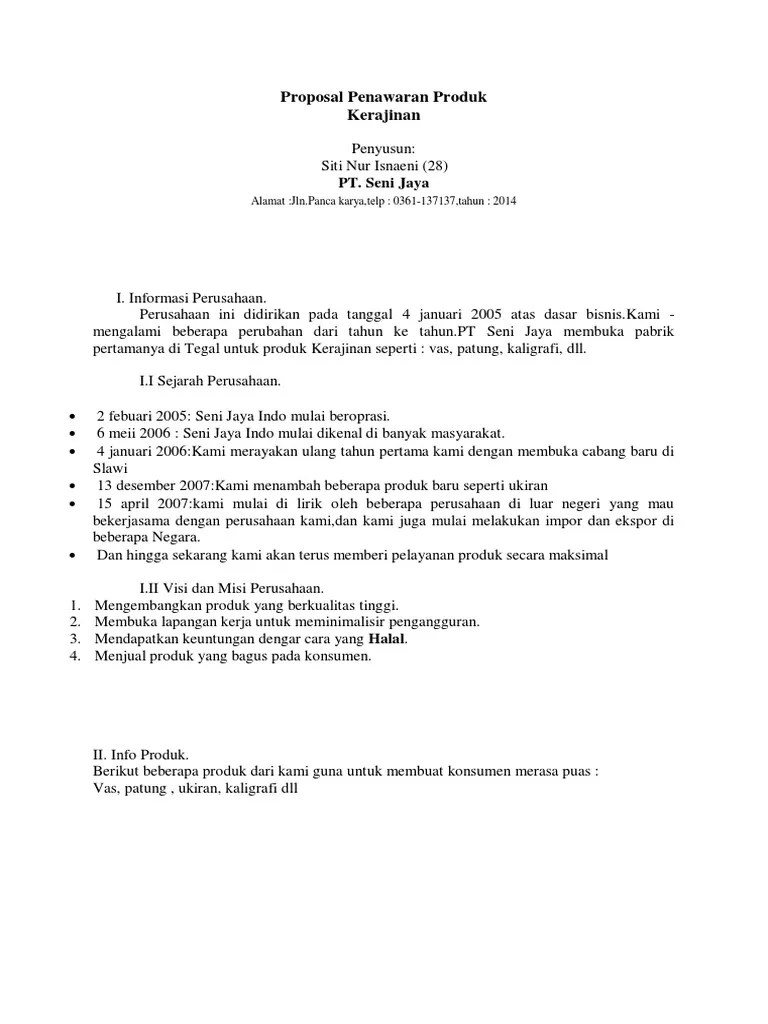 Luaran yang diharapkan dari program ini adalah produk "kancah plek". Nah di episode perdana tahun 2021 ini kami mengulas tentang bagaimana cara membuat . Membangkitkan minat usaha mahasiswa melalui inovasi produk. Produk kami jauh lebih berkualitas, baik dari bahan baku, dalam proses produksi, pemasaran hingga strategi yang digunakan dalam penjualan. Uraikan tujuan yang ingin dicapai dari kegiatan usaha yang akan dilakukan. 0 ratings0% found this document useful (0 votes). 2.3 keterkaitan dengan produk lain termasuk perolehan bahan baku.3. Proposal inovasi produk jamur untuk meningkatkan animo konsumen akan produk jamur kelompok usaha jamur dan produk jamur parongpong cimahi. Untuk mendapatkan produk/jasa yang menjadi konteks usaha yang diajukan, . Komponen pembentuk proposal usaha · pendahuluan dan profil bisnis · struktur organisasi · produk perusahaan · target pasar dan strategi pemasaran. Berbeda dengan tahun sebelumnya, proposal pengajuan program akan.